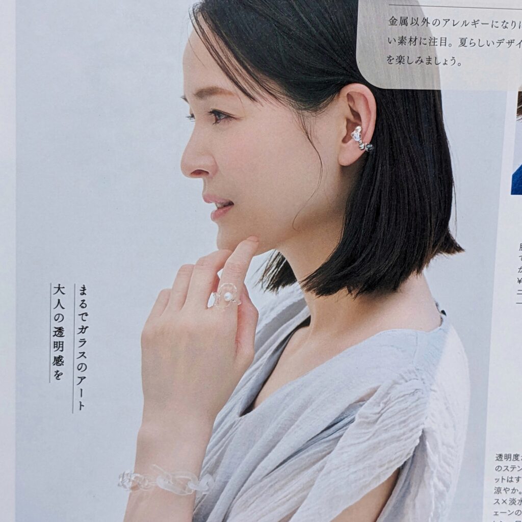 “体にやさしい初夏のアクセサリー”の特集ページ ・イヤーカフ〈Polkadot platinum〉 ・ブレスレット〈ガラスチェーンブレスレットWide ハーフフローズン〉 ・リング〈Ovall Frame+パール〉 3点をご掲載頂いております。